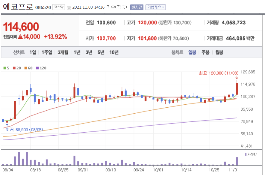 일봉상 금일 11월 3일 전고점 돌파 시도, 거래량은 50일 신고 거래량은 달성했습니다. 장마무리 시점엔 60일 신고거래량도 넘어설 수 있을 것 같습니다. 단기 횡보와 매집으로 보이는 거래량 가뭄이 다소 해소되고 이슈로 튀어오르는 형국입니다.