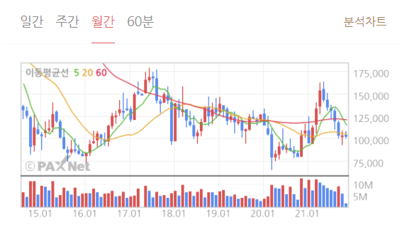 한국조선해양 월봉을 보면 가격대는 매력적입니다. 위드 코로나로 조선업계가 다시 살아날 경우, 대형주 치고는 장기적으로 꽤 큰 수익률을 기대해 볼 수 있는 가격대이기도 합니다.