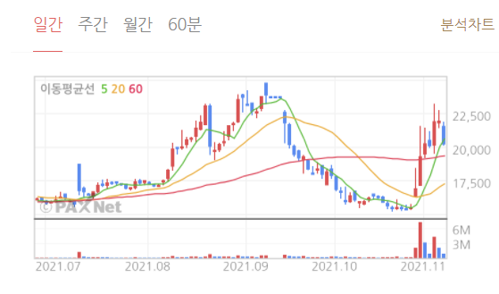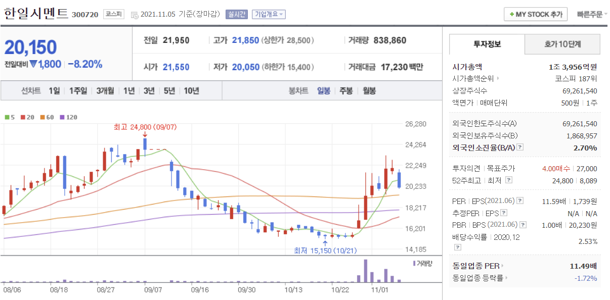 시멘트 섹터의 호황으로 주가 상 꽤 큰 영향을 받은 종목으로 보입니다. 가장 먼저 반응했다고 체감상 느껴집니다. 변동폭이 크다는 것은 그만큼 위험과 기회가 공존하고 있다고 볼 수 있겠는데요. 장기적으로 내년 상반기에 슈팅을 예상한다면 조심하게 접근할 종목이라 생각됩니다. 반대로 변동폭을 노려서 내년 슈팅 전에도 재미를 볼 기회는 열어 두는 것도 필요하겠습니다.