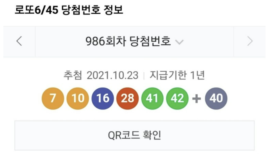 복권수탁사업자 (주)동행복권은 제 986회 로또 추첨 결과 1등 당첨번호는 '10,7,42,28,41,16', 2등 보너스번호는 '40'이라고 23일 밝혔다.